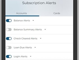 The Subscription Alerts allows you to add alerts for balances, checks cleared, loans due, logins, transactions, and transfers.